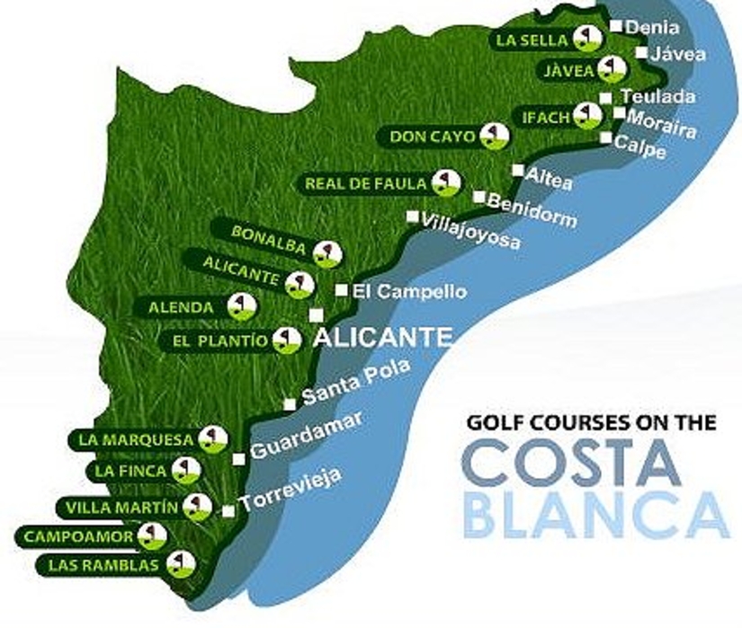 La Costa Blanca es hoy uno de los principales centros internacionales de referencia en la práctica del golf con 21 campos ( 3 de ellos Pitch & Putt) emplazados en un paisaje típicamente mediterráneo.Ofrecen variedad y calidad y llevan la firma de las más prestigiosos diseñadores y campeones de golf.Cada uno de ellos, con caracerísticas distintas, satisface las diferentes apetencias de los jugadores más exigentes.
